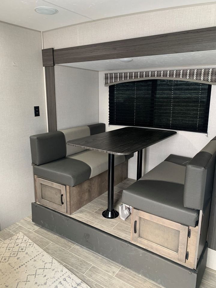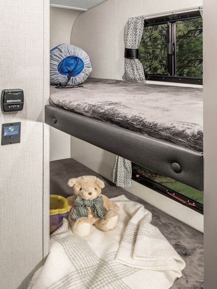 The 169VUD offers a double bunk, large 65" x 48" dinette, a 60" x 75" queen bed and large dry bath (sleeps 6). All kitchens feature a 8 CU FT electric double-door refrigerator for ample food storage, 2-burner stainless steel cooktop, microwave, roller ball bearing drawer guides, and cabinets with mortise and tenon hardwood cabinet doors. This trailer comes with upgraded off-road tires, power tongue jack, and a TV.